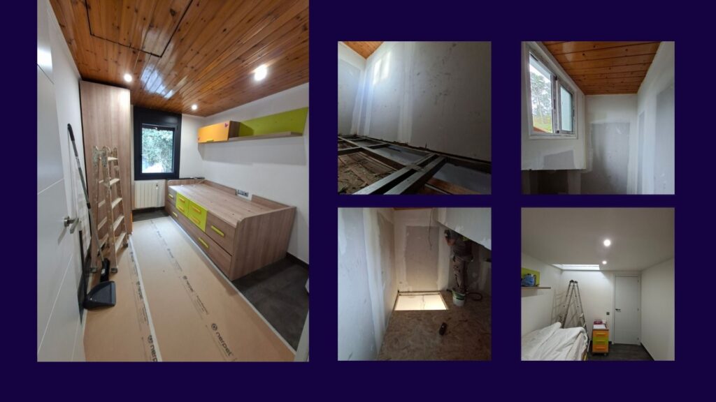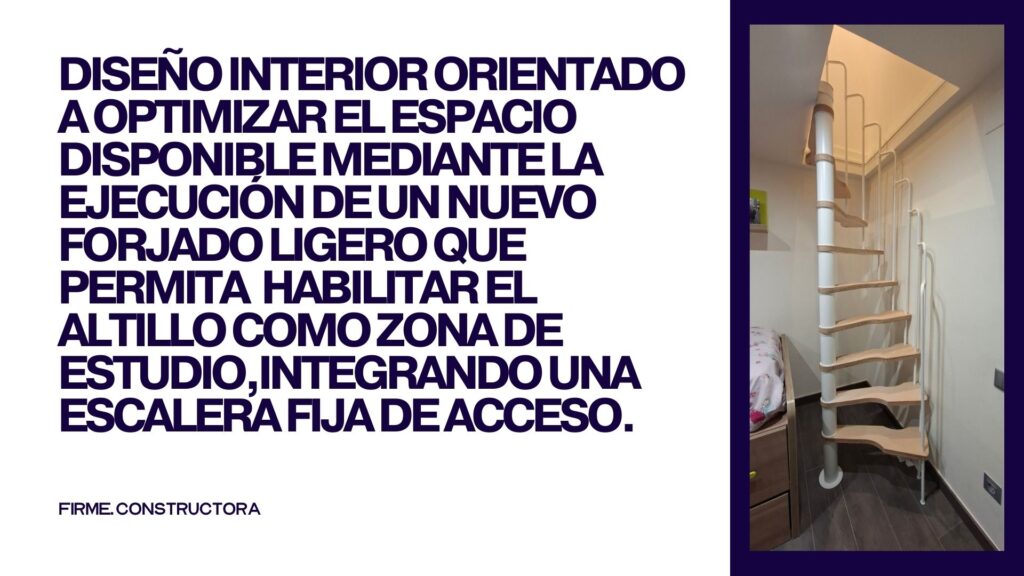 Diseño interior orientado a optimizar el espacio disponible mediante la ejecución de un nuevo forjado ligero que permita habilitar el altillo como zona de estudio, integrando una escalera fija de acceso, basado en nuestro método Firme.
