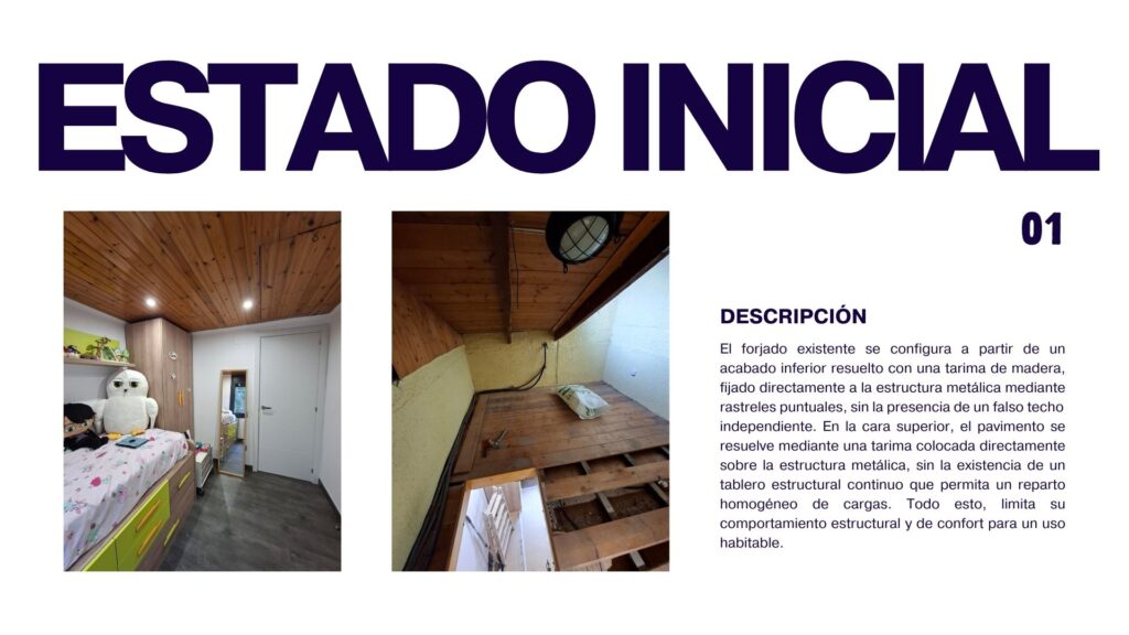El forjado existente se configura a partir de un acabado inferior resuelto con una tarima de madera, fijado directamente a la estructura metálica mediante rastreles puntuales, sin la presencia de un falso techo independiente. En la cara superior, el pavimento se resuelve mediante una tarima colocada directamente sobre la estructura metálica, sin la existencia de un tablero estructural continuo que permita un reparto homogéneo de cargas. Todo esto, limita su comportamiento estructural y de confort para un uso habitable.