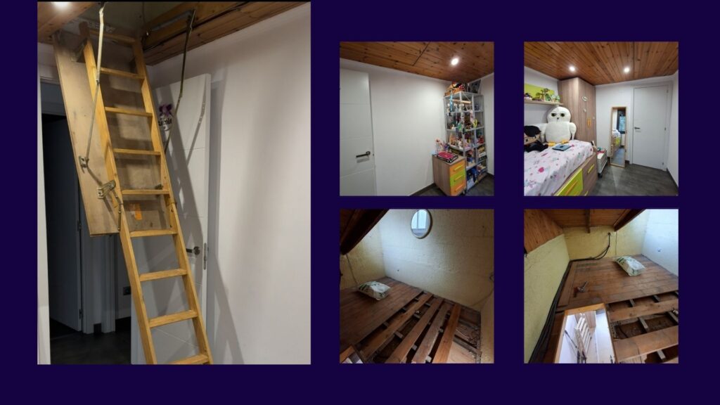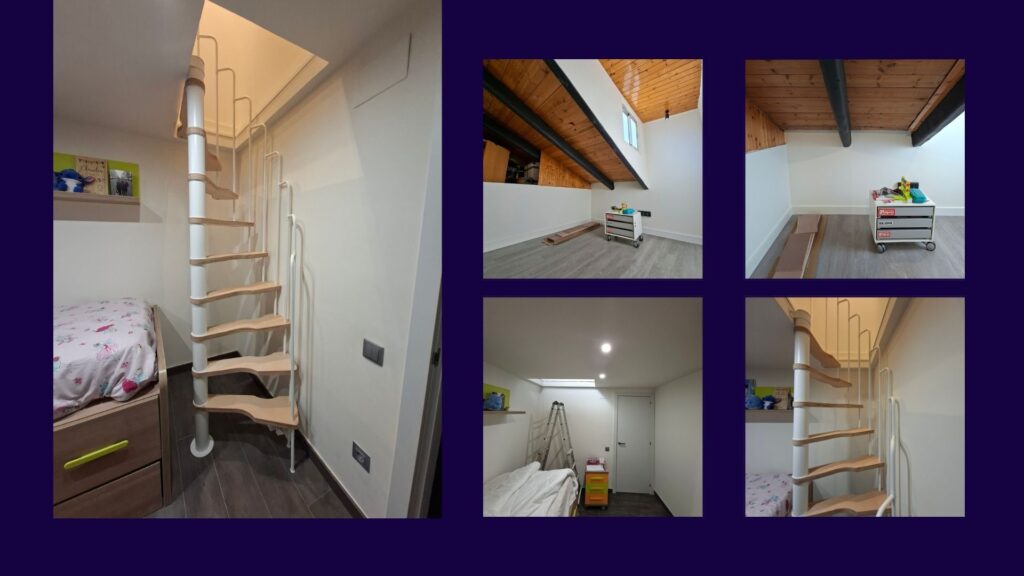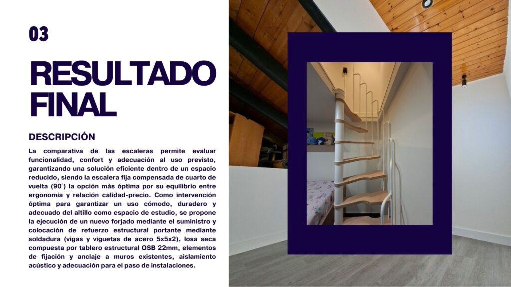 La comparativa de las escaleras permite evaluar funcionalidad, confort y adecuación al uso previsto, garantizando una solución eficiente dentro de un espacio reducido, siendo la escalera fija compensada de cuarto de vuelta (90°) la opción más óptima por su equilibrio entre ergonomía y relación calidad-precio. Como intervención óptima para garantizar un uso cómodo, duradero y adecuado del altillo como espacio de estudio, se propone la ejecución de un nuevo forjado mediante el suministro y colocación de refuerzo estructural portante mediante soldadura (vigas y viguetas de acero 5x5x2), losa seca compuesta por tablero estructural OSB 22mm, elementos de fijación y anclaje a muros existentes, aislamiento acústico y adecuación para el paso de instalaciones.