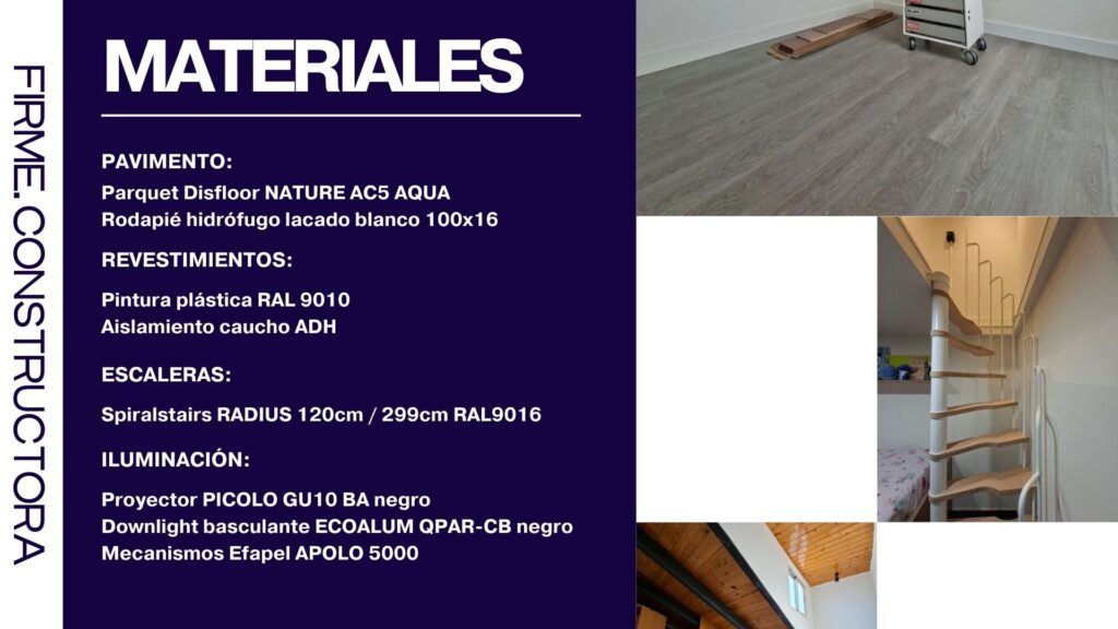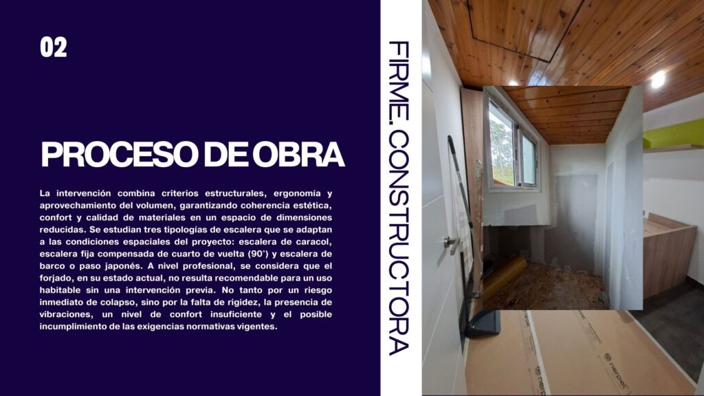 La intervención combina criterios estructurales, ergonomía y aprovechamiento del volumen, garantizando coherencia estética, confort y calidad de materiales en un espacio de dimensiones reducidas. Se estudian tres tipologías de escalera que se adaptan a las condiciones espaciales del proyecto: escalera de caracol, escalera fija compensada de cuarto de vuelta (90°) y escalera de barco o paso japonés. A nivel profesional, se considera que el forjado, en su estado actual, no resulta recomendable para un uso habitable sin una intervención previa. No tanto por un riesgo inmediato de colapso, sino por la falta de rigidez, la presencia de vibraciones, un nivel de confort insuficiente y el posible incumplimiento de las exigencias normativas vigentes.