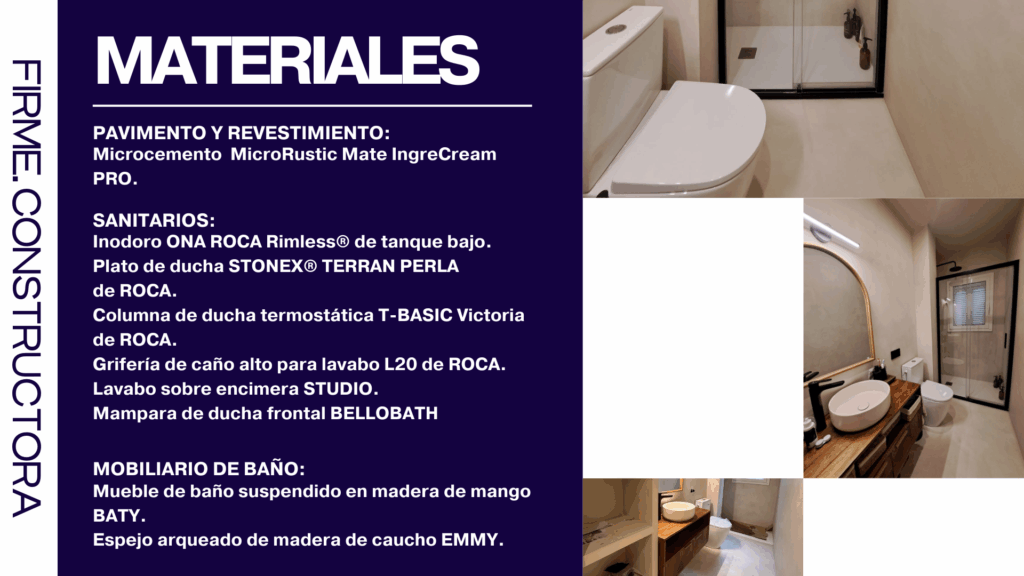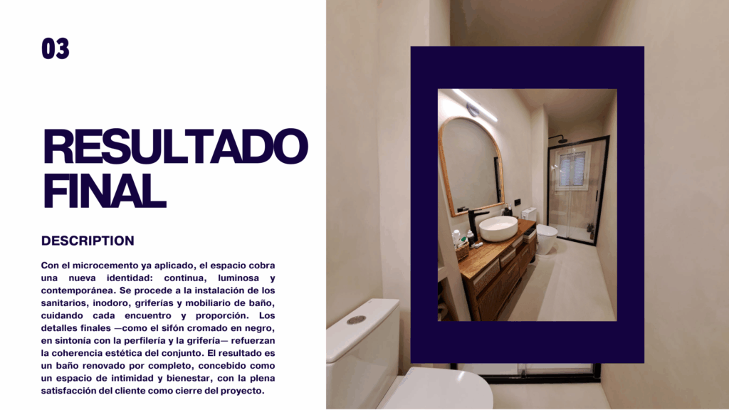 Con el microcemento ya aplicado, el espacio cobra una nueva identidad: continua, luminosa y contemporánea. Se procede a la instalación de los sanitarios, inodoro, griferías y mobiliario de baño, cuidando cada encuentro y proporción. Los detalles finales —como el sifón cromado en negro, en sintonía con la perfilería y la grifería— refuerzan la coherencia estética del conjunto. El resultado es un baño renovado por completo, concebido como un espacio de intimidad y bienestar, con la plena satisfacción del cliente como cierre del proyecto.
