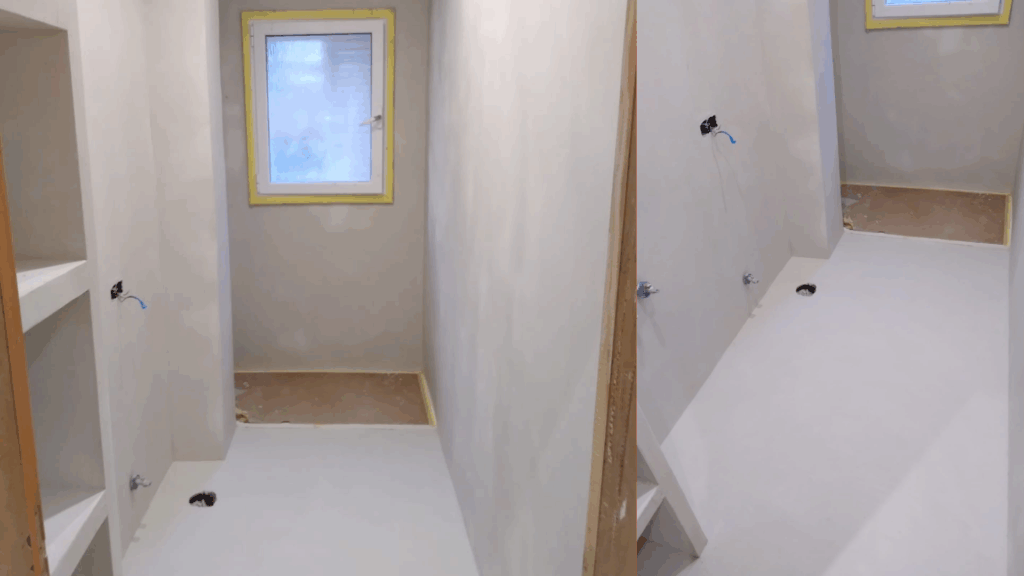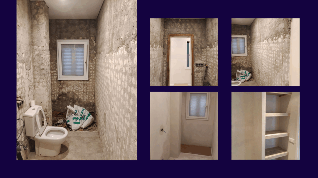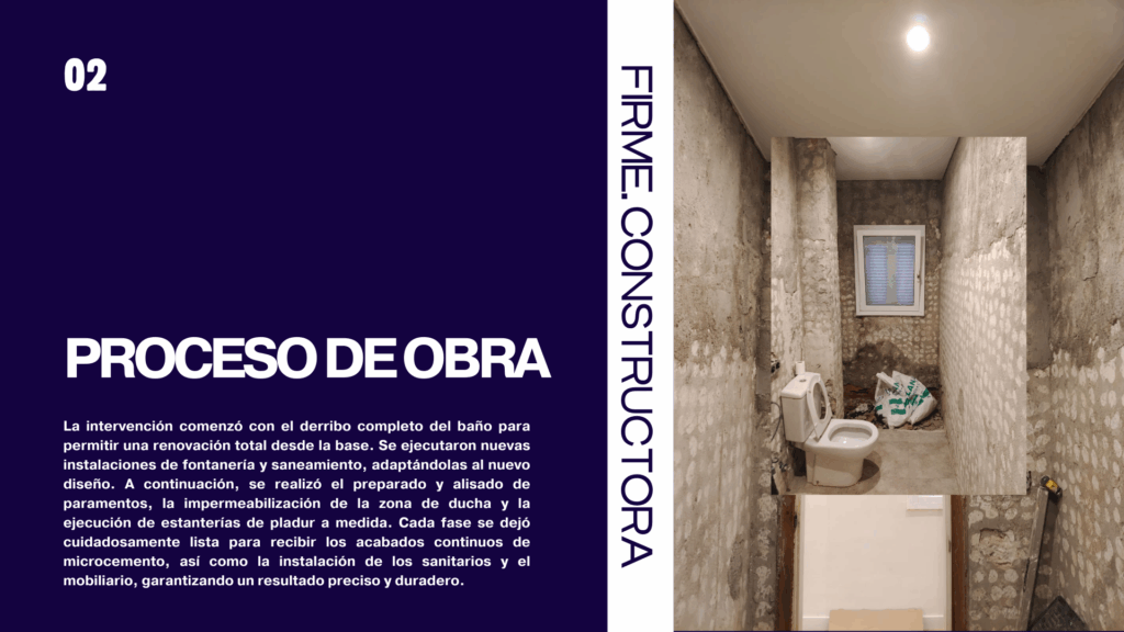 La intervención comenzó con el derribo completo del baño para permitir una renovación total desde la base. Se ejecutaron nuevas instalaciones de fontanería y saneamiento, adaptándolas al nuevo diseño. A continuación, se realizó el preparado y alisado de paramentos, la impermeabilización de la zona de ducha y la ejecución de estanterías de pladur a medida. Cada fase se dejó cuidadosamente lista para recibir los acabados continuos de microcemento, así como la instalación de los sanitarios y el mobiliario, garantizando un resultado preciso y duradero.