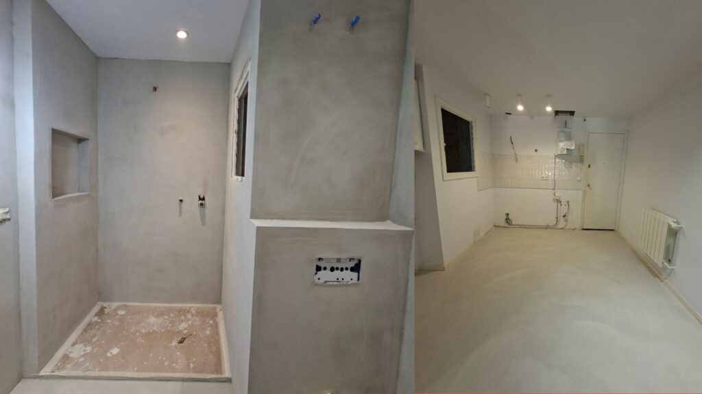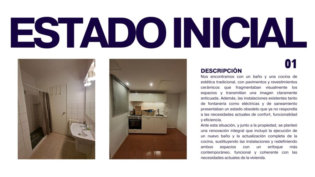 Nos encontramos con un baño y una cocina de estética tradicional, con pavimentos y revestimientos cerámicos que fragmentaban visualmente los espacios y transmitían una imagen claramente anticuada. Además, las instalaciones existentes tanto de fontanería como eléctricas y de saneamiento presentaban un estado obsoleto que ya no respondía a las necesidades actuales de confort, funcionalidad y eficiencia.