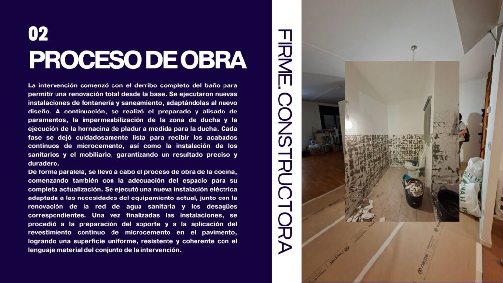 Con los revestimientos y pavimentos continuos ya finalizados, el espacio adquiere una nueva identidad: más luminosa, ordenada y contemporánea. En el baño se procede a la instalación de los sanitarios, griferías y mobiliario, cuidando cada encuentro y proporción para mantener la coherencia estética del conjunto.