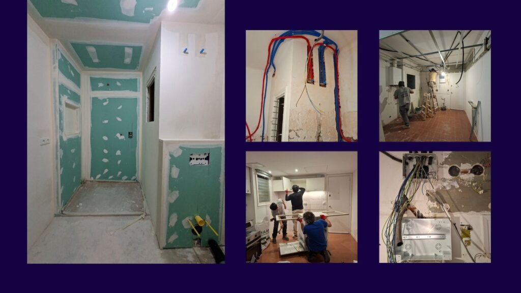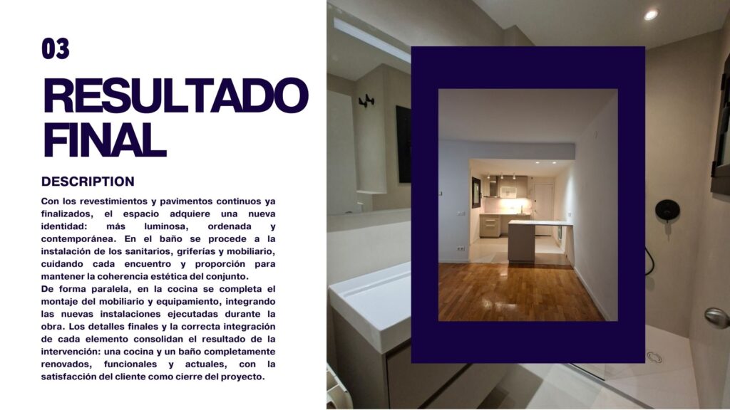 De forma paralela, en la cocina se completa el montaje del mobiliario y equipamiento, integrando las nuevas instalaciones ejecutadas durante la obra. Los detalles finales y la correcta integración de cada elemento consolidan el resultado de la intervención: una cocina y un baño completamente renovados, funcionales y actuales, con la satisfacción del cliente como cierre del proyecto.